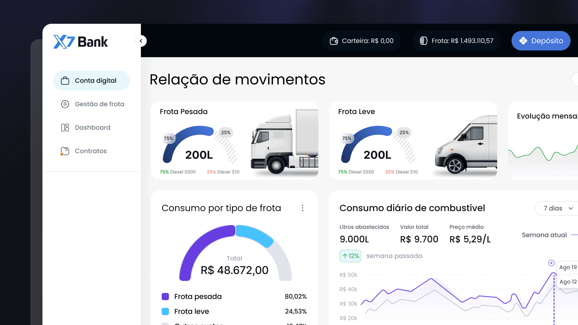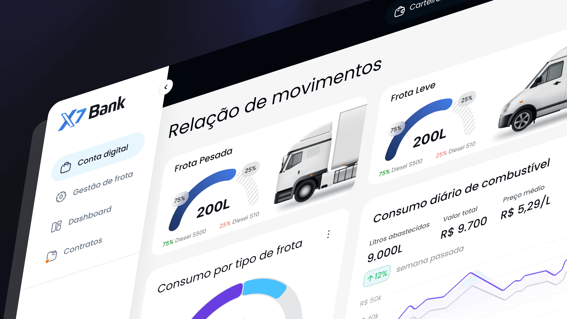 No topo, destaquei indicadores principais como carteira, saldo da frota e ações rápidas, permitindo acesso imediato às operações mais importantes.